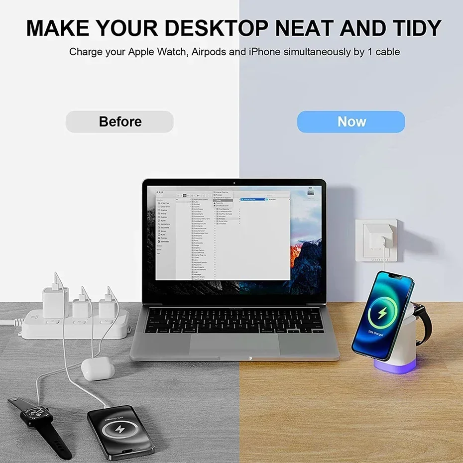 Compatible equipment:This charging station is suitable for various Apple devices (for iPhone 16/15/14/13/12 Series Macsafe /11/11 Pro/11 Pro Max/XS/ XR / XS MAX /X/8/8Plus (can wirelessly charge qi mobile phones, watch models only support Apple Watch Ulltra/SE/8/7/6/5/4/3)
