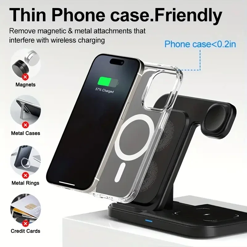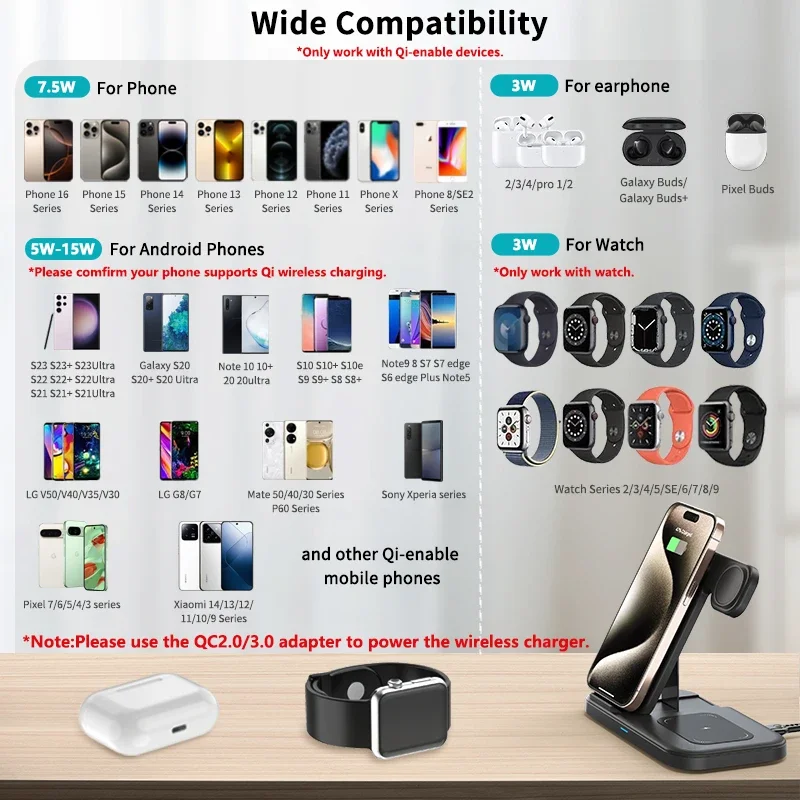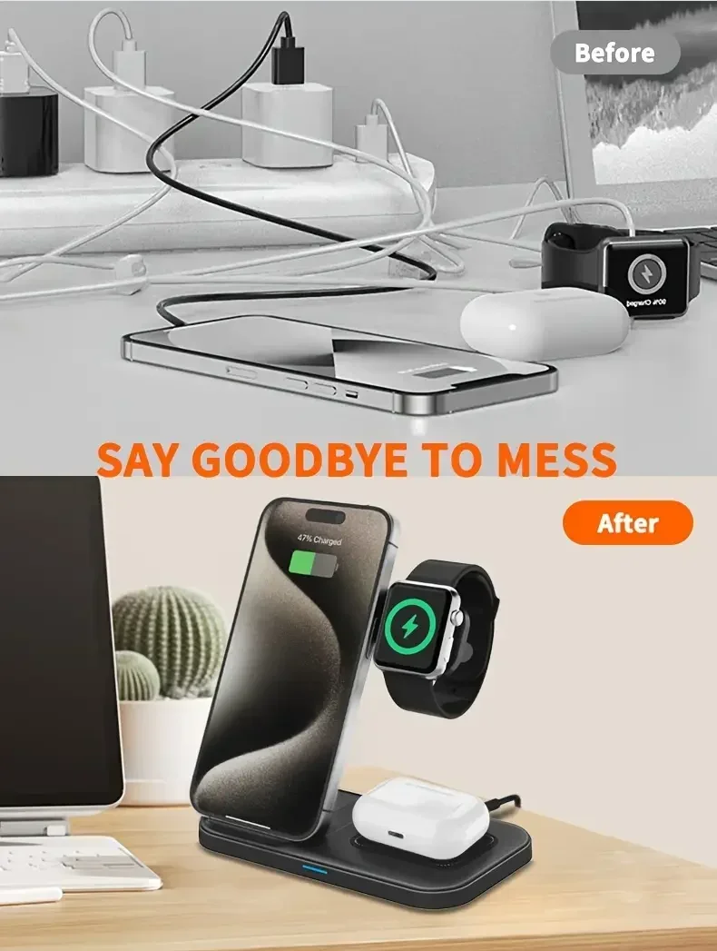 3 IN 1 WIRELESS CHARGER STAND: wireless charging station can charge your for apple iwatch 2/3/4/5/6/SE/7/8/9/10 Ultra【CAN NOT for Samsung Watch】, Airpods Pro/2/3/Pro2, phones at the same time, such as for iPhone 16/15/14/14 Plus/14 Pro/14 Pro Max/13/13 Pro/13 Pro Max/13 Mini/12/12 Pro/12 Pro Max/12 Mini/11/11 Pro/11 Pro Max/SE/8/8 plus, Samsung GalaxyS25/S24/S23/ S22/S21/S20/S10 series and all Qi-certified devices. Say goodbye to the messy cords, makes your desk and nightstand neatly and organized. For better charging experience
