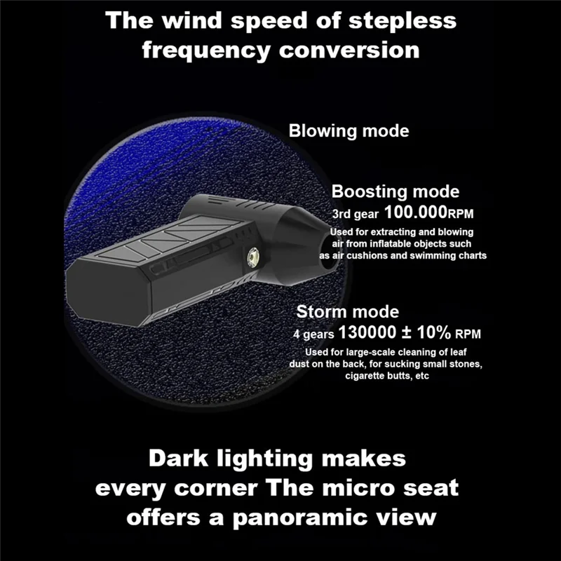 This jet fan is simple in design, reasonable in structure, and powerful in performance. Adopting a brushless motor, with 130,000RPM high speed can provide surging blowing power, strong wind power, one button switch, and easy and convenient operation, with perfect dust removal effect. Suitable for carbon fire blowing, industrial dust blowing, soot blowing, keyboard cleaning, car and motorcycle cleaning, car center console cleaning, car crevice cleaning, foot mat crumb cleaning, picnic garbage cleaning, air-cushions inflating, etc.