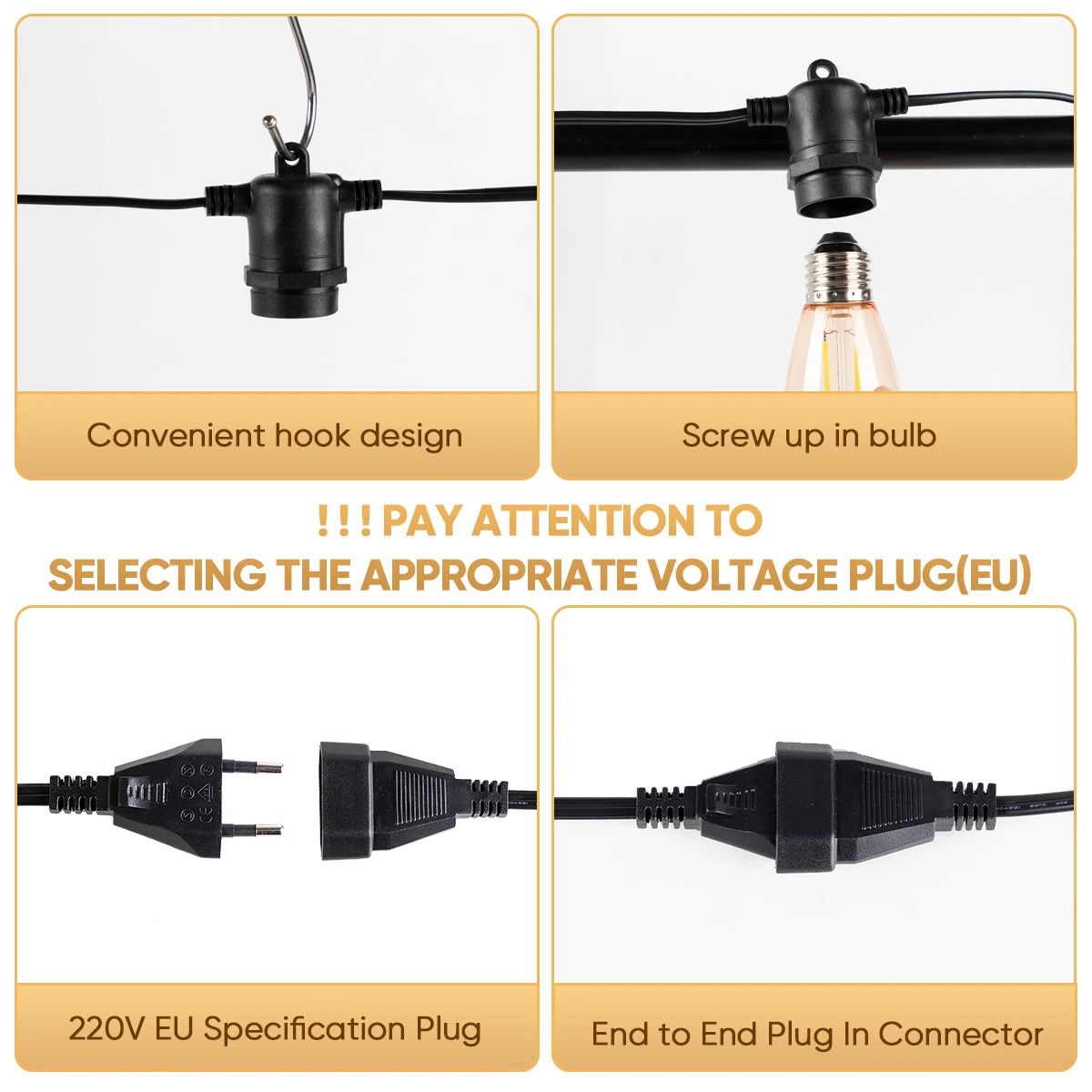 The EU plug is suitable for 220V.Please pay attention to whether the light string plug and voltage are correct.Only applicable to 220V E26/E27 base bulbs.