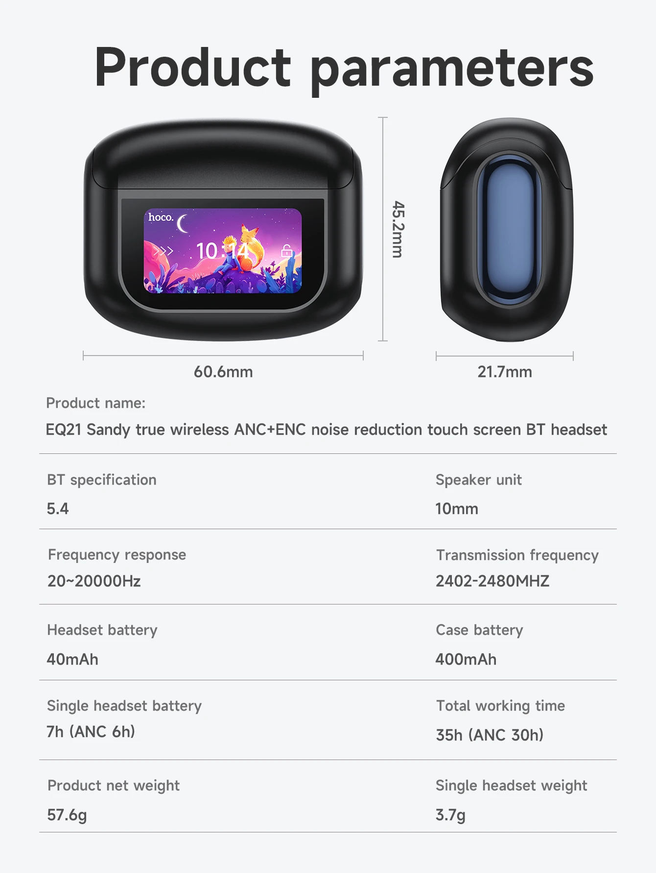 Model Name: HOCO EQ21 true wireless ANC+ENC noise reduction touch screen BT headset