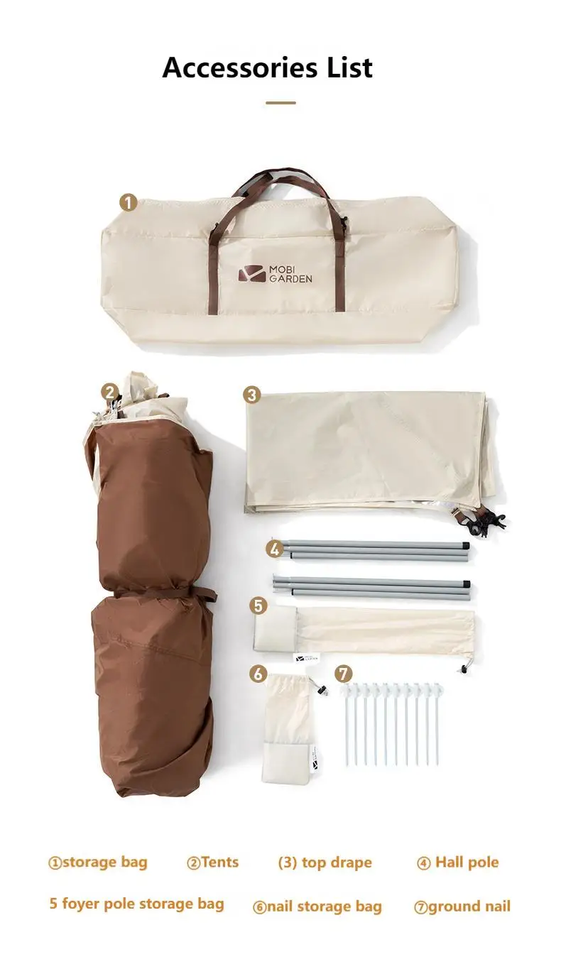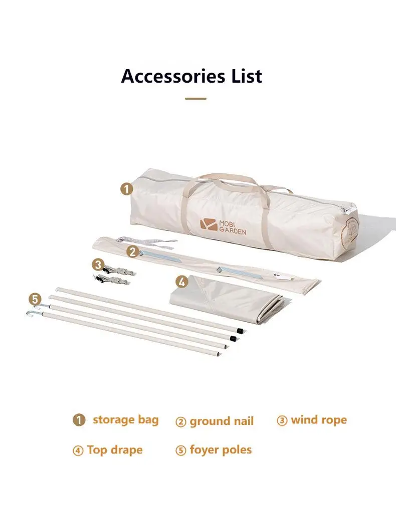 Product List: Storage Bag / Tent / Top Shed / Door Hall Pole / Door Hall Pole Storage Bag / Wind Rope*6 / Ground Nail*10 / Ground Nail Storage Bag