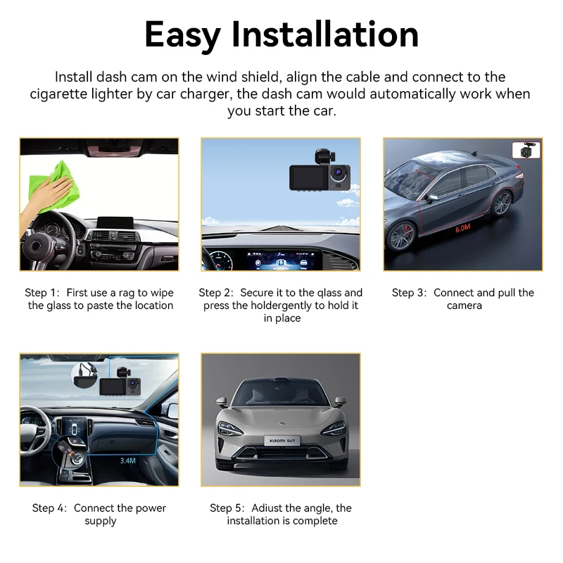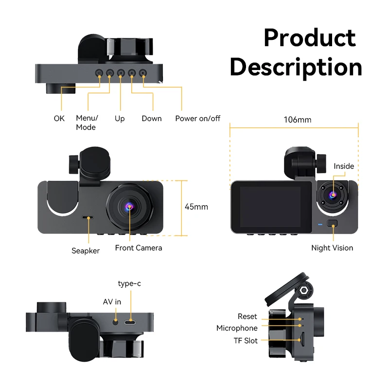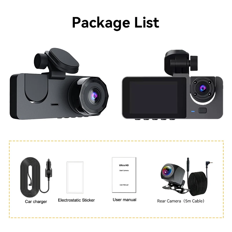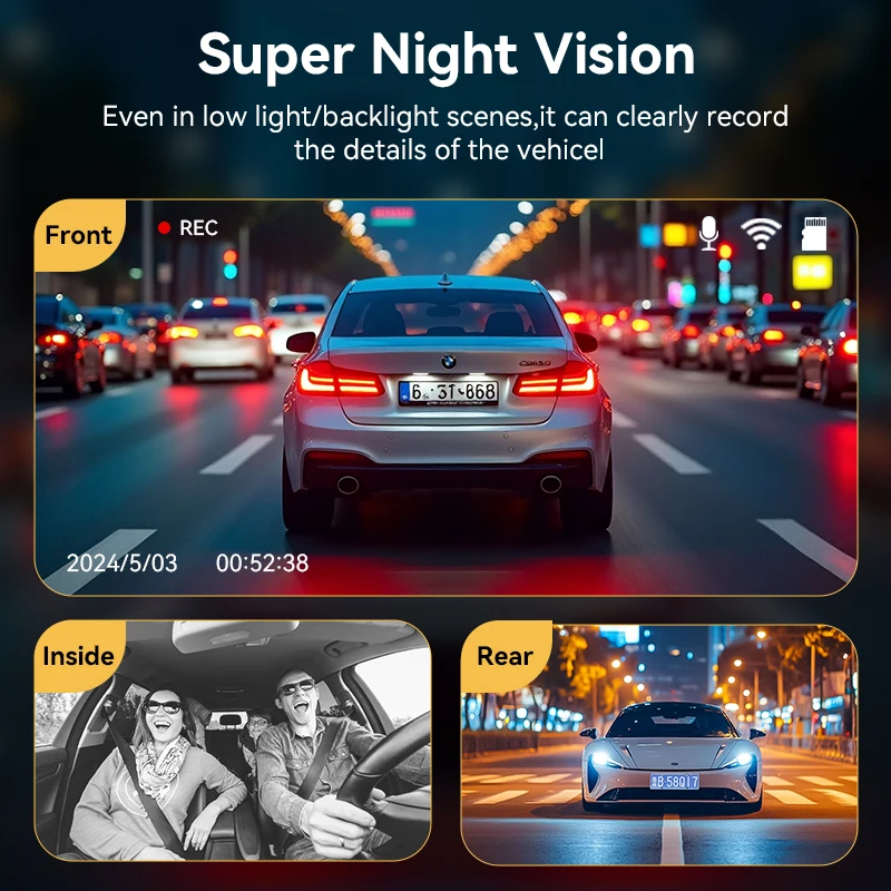 -Triple channel recording: front (2K), internal (1080P) and rear (Full HD).