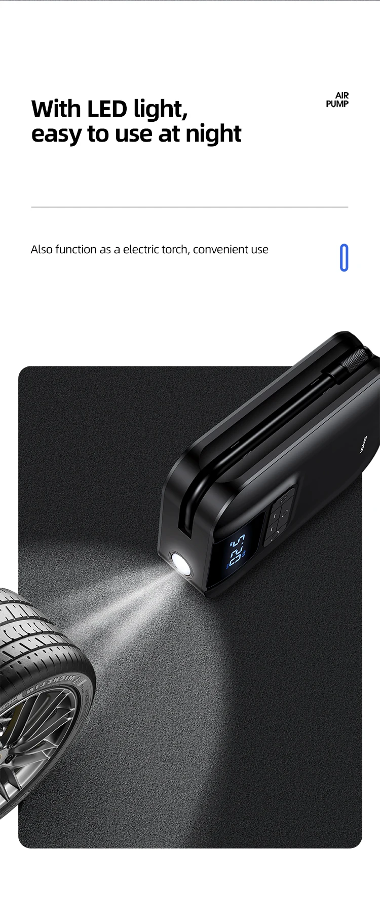 Features: 1. Preset tire pressure, stop when fully inflated, safe &convenient. 2. Wide application, inflate bicycles/motorcycles/cars/balls. 3. LED screen digital display, clear function settings. 4. 5000mAh big capacity, long battery life. Attentions: 1.This product is not suitable for tires requiring high capacity/high air pressure. 2.Do not touch air tube/inflation port when the air pump is working. After it stops working, please wait for 3-5 mins then pull out air tube. 3.It is recommended to use the product for no more than 10 mins at a time. If there is any abnormal noise, please turn it off and cool down for 10 mins before using it.