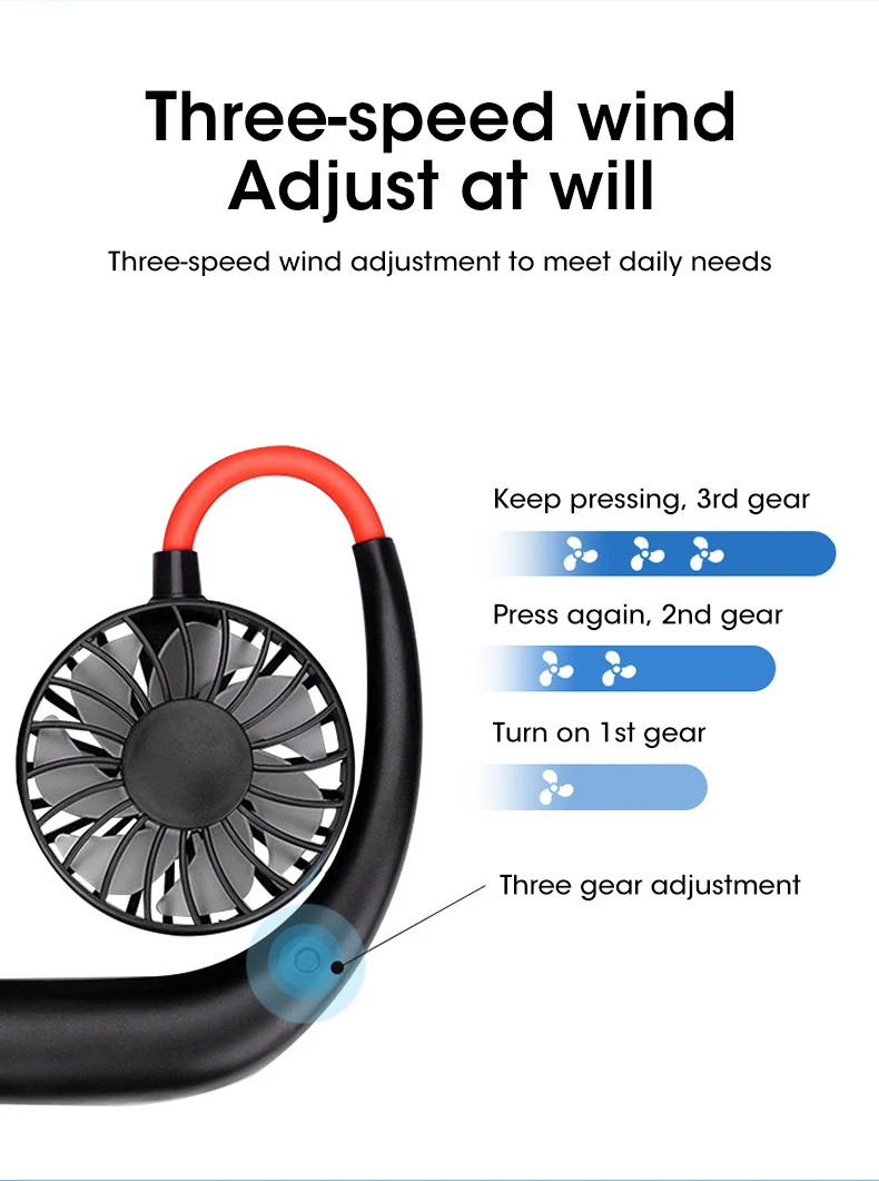 3.Speed Adjustable: Hand free personal fan 3 different speed level can adjust, low, medium, high, just need to press the power button to adjust.
