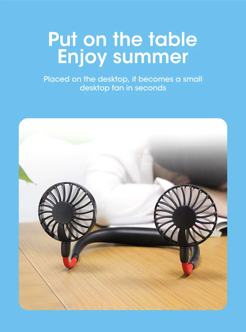 4.4 Colors Optional: Mini neck double fans are built-in 1200mAh battery, can quickly charging and long time using, Black, Pink, White, you can according to your likes to choose.
